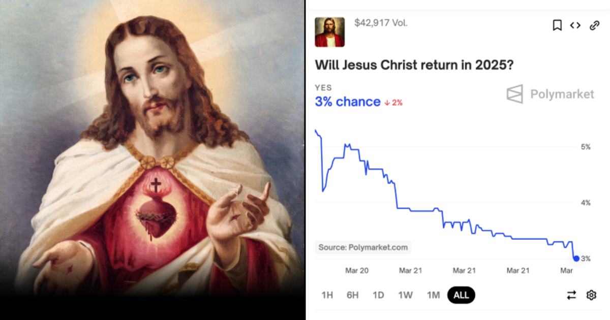 Polymarket | This market will resolve to "Yes" if The Second Coming of Jesus Christ occurs by December 31, 2025, 11:59 PM ET. Otherwise, this market will res...